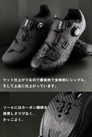 ダイヤル式でフィット感を微調整出来て、片手でダイヤル操作も可能なサイクルシューズです。靴底ソールはカーボン調柄でさりげないけれど、高級感あふれる仕様となっています。