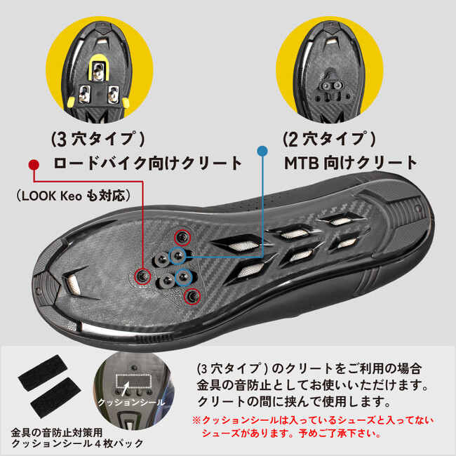 3タイプのビンディング用クリート対応の自転車サイクルシューズで、ロードバイクからMTBまで幅広く使え、