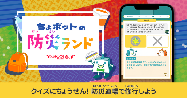 Yahoo! JAPANが運営する子ども向けの安全安心なポータルサイト「Yahoo!きっず」は、「地震・津波」「台風・大雨」に関する知識を学習記事や動画、クイズで楽しく学ぶことができる「ちょボットの防災ランド」を提供しています。災害発生時に、学んだ知識を活かしてもらえることを目的に、2021年3月から提供しているクイズは、子どもたちが防災に関する知識をクイズ形式で正しく、楽しく学べることからご家庭や学校での利用も増えています。