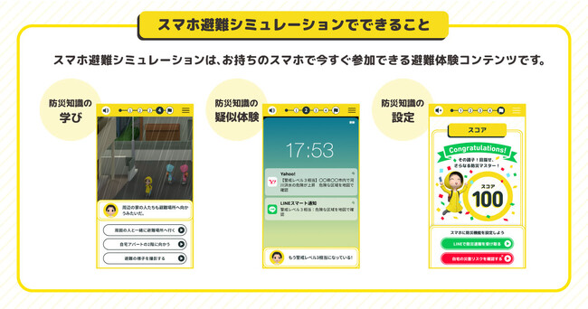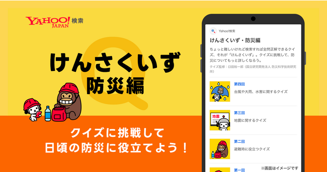 防災コンテンツは、ゲームやクイズで防災を学べる「スマホ避難シミュレーション<地震編・水害編>」「ちょボットの防災ランド」「けんさくいず 防災編」、地震や水害への備えを知るためのニュースコンテンツ、災害への備えを見直す「おくる防災」や検索活用法の紹介、災害に備えて寄付する「災害復興みらい募金(Yahoo!基金)」を展開します。