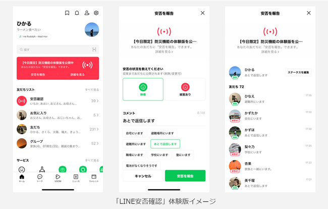 ※「LINE安否確認」体験版の公開中に震度6以上の地震など大規模な災害が発生した場合は、ただちに体験版は中止し、災害の状況に応じて実際の「LINE安否確認」を提供します。