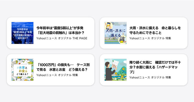 Yahoo! JAPANが運営する「Yahoo!ニュース」における「#災害に備える」をテーマとした記事で備えや避難方法などを確認できます。