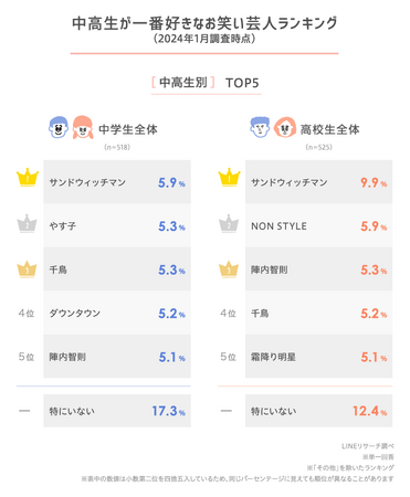 【LINEリサーチ】中高生が一番好きなお笑い芸人、全体1位は「サンドウィッチマン」。今後ブレイクしそうだと思うお笑い芸人は、「令和ロマン」が全体1位に
