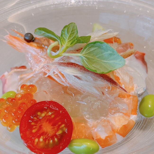 また、冷製料理の魚介のセビーチェは、レモンとライムが爽やかな海老と蛸、帆立のマリネを、紫蘇の香りのジュレでアレンジし、さっぱりとお召し上がりいただけます。