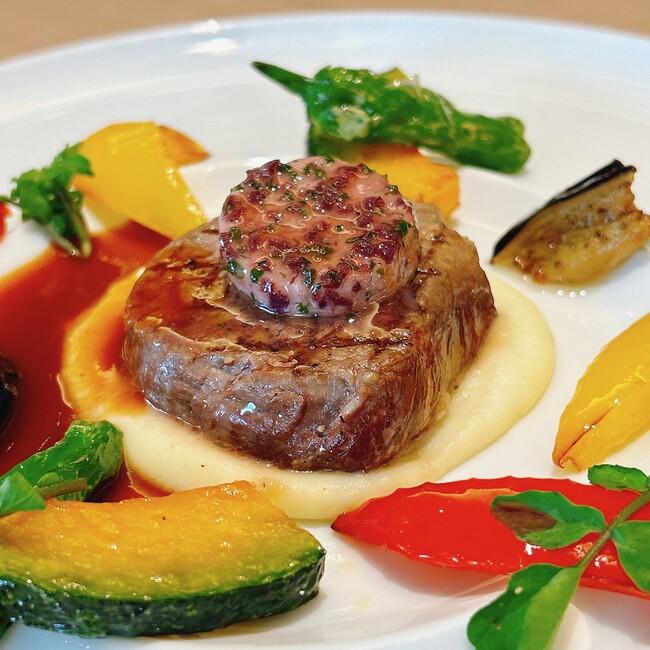 ランチ、ディナーともに牛フィレ肉を使用したクラシックなフランス料理をメインにしております。ランチは、しっとりと柔らかい牛フィレ肉に赤ワインが香るマルシャンヴァンバター、芳醇な風味とコクと甘味のあるマデラソースで仕立てた、「牛フィレ肉のグリエ マルシャンヴァンバター添え」です。ディナーは、牛フィレ肉に濃厚なフォアグラを乗せ、トリュフの香りのぺリグーソースで仕立てた、「牛フィレ肉とフォアグラのロッシーニスタイル ペリグーソース」です。