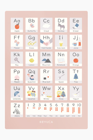B3サイズの「キッズお風呂ポスター かな」と横に並べる際すっきりするよう、 「キッズお風呂ポスター ABC」 はB4サイズにし、高さが揃うように工夫しました。また、カラーはKEYUCAで人気のくすみカラーを採用し、お風呂のインテリアにも馴染みます。