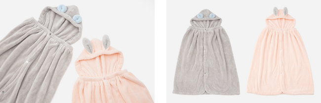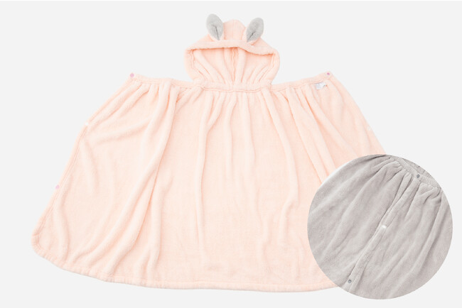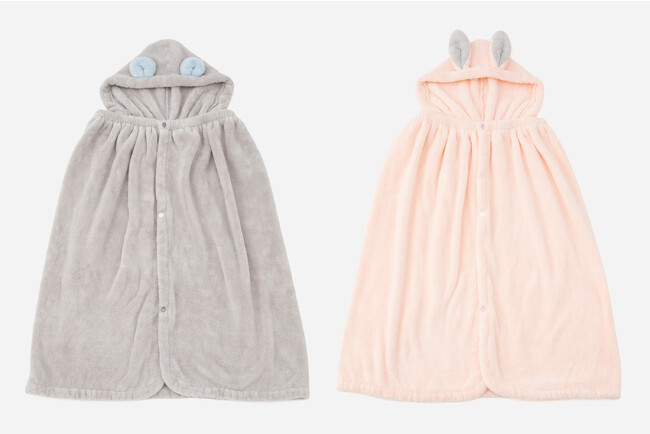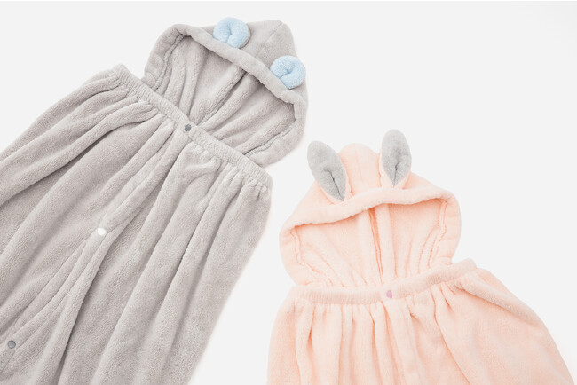 同シリーズの「吸水速乾ヘアキャップ」同様、フードには子どもが喜ぶウサギとクマの耳のモチーフを施しています。さらに、ママ・パパにとってもうれしい、KEYUCAらしい落ち着いた色の組合せで展開。また、首回りはゴム入りで約64〜126cmとよく伸び、ボタンを留めたまま腕を出すことができたり、子どもでも楽に着替えられる仕様に。大人もポンチョとしての使用が可能です。