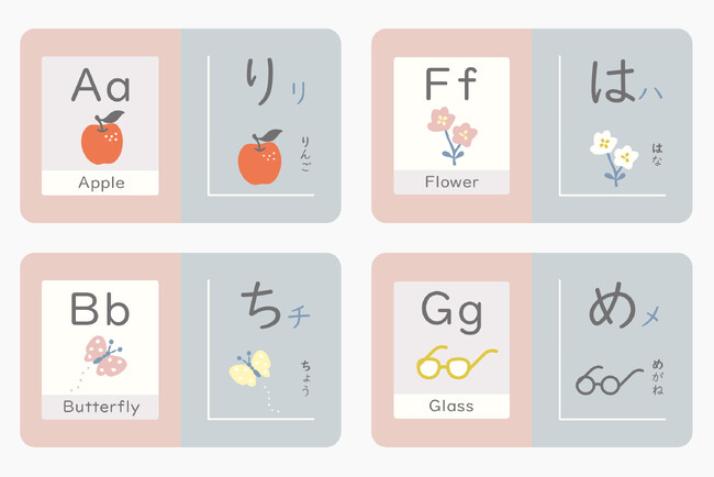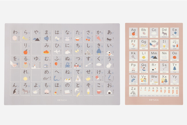 並べることで、ひらがなとアルファベットを同時に学べるよう、登場するモチーフはできるだけ同じものをセレクトしています。さらに、KEYUCAで人気のくすみカラーと、従来の「かな」タイプと高さが揃うようにB4サイズを採用することで、お風呂のインテリアに馴染みやすいデザインにしました。