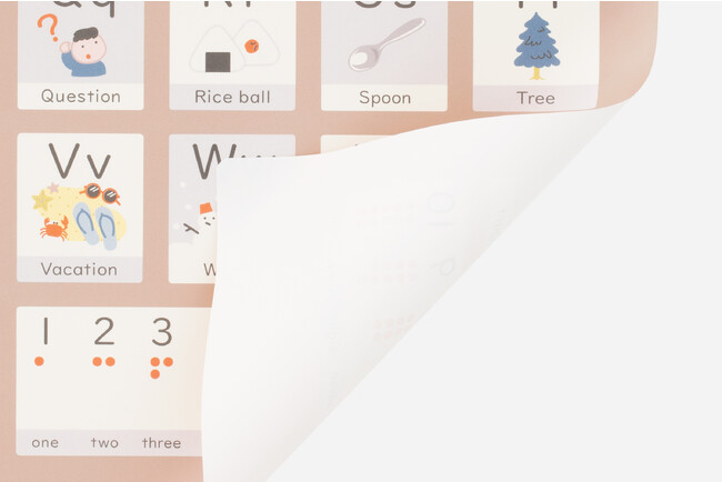 シリーズ商品である、「キッズお風呂ポスター かな」とセットで使用することで、「かな」と「ABC」を同時で学べるよう、登場するモチーフはできるだけ同じものをセレクトしています。また、ひらがなもABCも、フォントは教育の場で使われる教科書体を採用し、正しい文字の形を学習できるよう工夫しました。