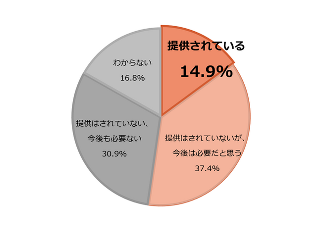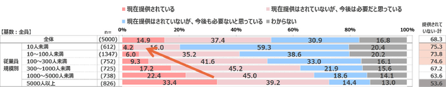 DXやデジタル活用を学ぶ機会の提供において、現状、「提供されている」と回答した人はわずが14.9%ということがわかりました。従業員規模別でみると、従業員数が少なくなるほど「提供されている」割合が減少傾向にあることが明らかになりました。