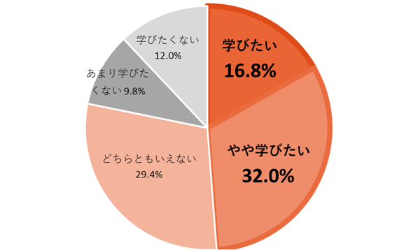 デジタル学習を今後「学びたい」「やや学びたい」と回答した人は48.7%という結果になりました。一方で「あまり学びたくない」「学びたくない」と回答した人が21.8%と学習意欲がない人も存在することが明らかになりました。