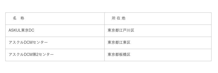 (※2)「ASKUL東京DC」(江戸川区臨海町)は、高台エリアのため洪水・高潮・津波等の水害のリスクは低いと言われています。