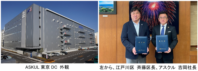 江戸川区は、荒川や江戸川などの大河川や東京湾に囲まれ、区の陸域の約7割がゼロメートル地帯(※1)にあたり、台風や大雨の自然災害での浸水被害への備えが必要な地域と言われています。本協定は、地震や台風等による災害が発生、または発生するおそれがある場合、江戸川区の要請に応じ、アスクルが江戸川区内で運営し、本年11月に全面稼働予定の物流センター「ASKUL東京DC」(※2)および近隣の「DCMセンター」(東京都江東区)、「DCM第2センター」(東京都板橋区)の在庫品から生活必需品等必要物資を提供するものです。
