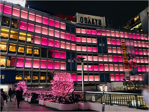 2つのビルからなる新宿店本館は、外観を一面アルミパネルのカーテンウォールに統一し、一つの建物のように見えるデザインが特徴的です。モダニズム建築で知られる坂倉準三氏が新宿駅西口広場と合わせて新宿店本館のデザインも手がけました。クリスマスシーズンには窓のライトを活用したイルミネーションを実施しました。
