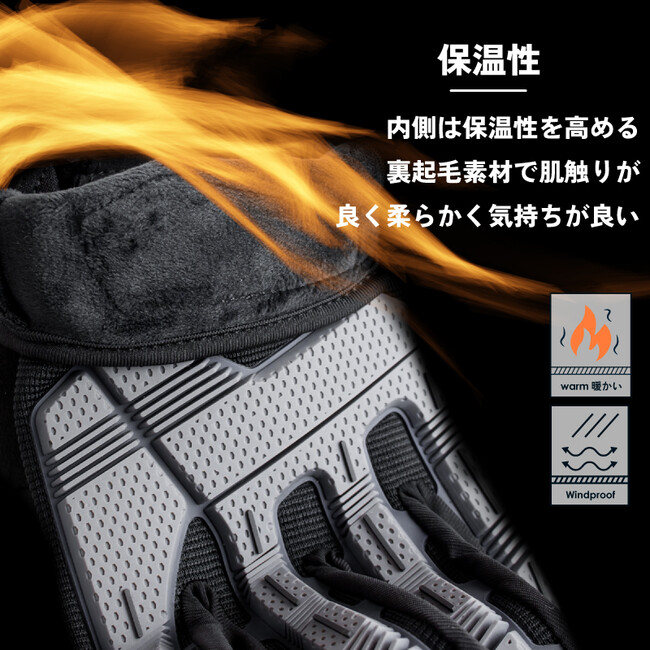 グローブ内は裏起毛で肌ざわりが良く保温性があり暖かく、