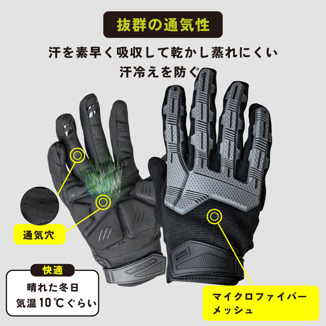 手の裏には無数の通気穴を設置している事で蒸れや汗冷えを防ぎます。