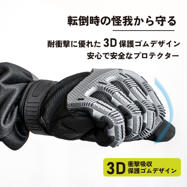 手の甲には耐衝撃に優れた3D保護ゴムを採用。転んで地面と接触しても極力怪我のリスクを軽減します。