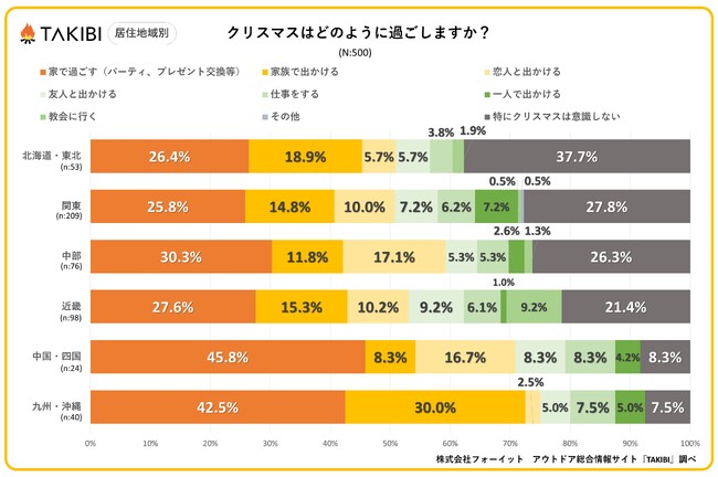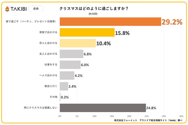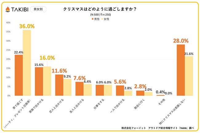 キャンプやグランピングを中心としたアウトドア総合情報サイト「TAKIBI」の運営をおこなう株式会社フォーイットは、全国の10代〜50代までの男女500人を対象にクリスマスに関するアンケートを実施し、男女別・年代別等の特徴についてまとめました。