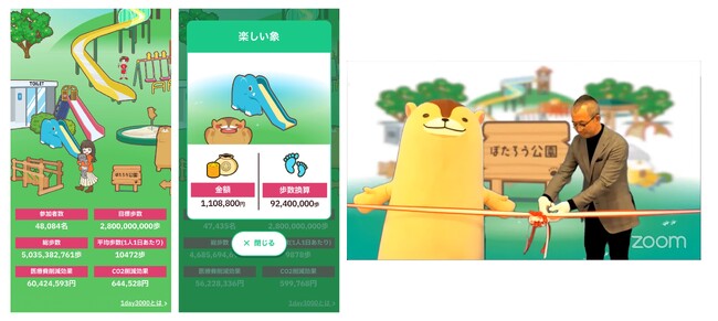 第8弾では、参加者数は51,728名、参加者の10日間の総歩数は50億3538万2761歩でした。本数値をベースとして、SROI分析を用いた歩行の社会的価値の可視化を行いました。イベント中には総歩数に合わせて増えていく医療費の削減額を公園の遊具の設備費に充てたと仮定し、架空の公園に遊具が増えていく表現を取り入れ、ダッシュボードとして公開しました。また、オンラインで開催したイベントの閉会式では、この架空の公園が完成したことを記念してテープカットセレモニーも行いました。参加者からは、「みんなで歩いた歩数を『公園づくり』という形で可視化されたのが斬新で面白かった」「歩くことで健康になり医療費削減、浮いたお金で社会貢献、という可能性が見えました」という声がありました。