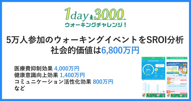 結果より、約5万人が参加した10日間のウォーキングイベントでは6,800万円の社会的価値があることがわかりました。なお、本取り組みはデロイト トーマツ ファイナンシャルアドバイザリー合同会社の協力のもと、SROI(Social Return on Investment)分析の手法を用いて実施したものです。