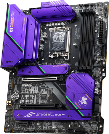 ひときわ目を引く、初号機のカラーリングをイメージした限定版B660 TOMAHAWK WIFIマザーボード。パープルとネオングリーンのおなじみのカラーリングで登場。チップセットヒートシンクには「NERV」ロゴ、そしてマザーボード全体には極太明朝のフォント「マティスEB」にて文字のデザインがされています。また、MSI Mystic LightにもEVANGELION e:PROJECT仕様の独自のライティングエフェクトを搭載し、より派手な演出が可能となっています。