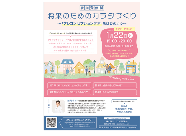 豊橋市在住・在勤・在学の方向けに、「将来のためのカラダづくり〜プレコンセプションケアをはじめよう〜」と題したプレコンセプションケアに関する知識の啓発セミナーを2024年1月22日に開催します。
