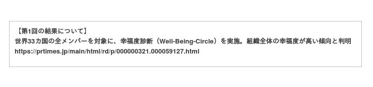 しかし、リモートワークはあくまでも手段。柔軟な働き方ができるからといって必ずしもメンバー全員が「幸せに」働けているとは限りません。そこで、2021年より「幸福度診断(Well-Being-Circle)」の実施をスタート。組織としてのあり方を模索するとともに、メンバー一人ひとりが主体的に「幸せ」を追求できているか、定期的に振り返りを行うことが狙いです。