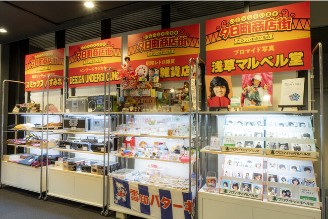 物販コーナーでは貴重な直筆サイン入り複製原画をはじめ、オリジナル商品の販売や、レトロ雑貨やプロマイド写真など昭和にまつわる商品を取り扱う店舗が出店する「夕日町商店街」を併設します。また、開催に先立ち実施された関係者向け内覧会での様子を公開します。