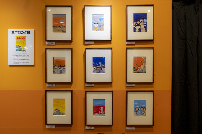 夕焼けを思わせるオレンジ色の壁と、影で描かれた街並みがノスタルジックな「三丁目の夕日 夕焼けの詩」コーナー。まず目に飛び込んでくるのは、物語に出てくる架空の街「夕日町三丁目」の巨大イラスト。