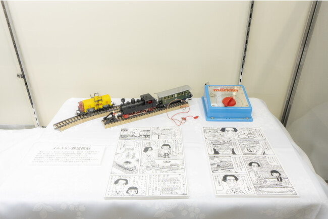 ガラスショーケースには先生が所蔵する鉄道模型や蓄音器、懐中時計やステレオカメラなど、物語にインスピレーションを与えた品々が展示されています。