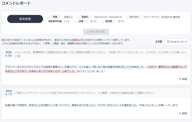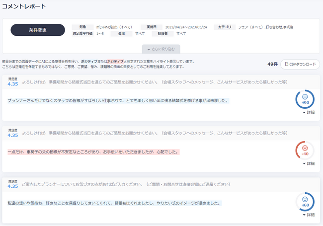 「コメントレポート」は、自然言語処理AIによる感情分析で、カップルの回答(フリーテキスト)から、ポジティブ/ネガティブなコメントを文章単位で抽出できる機能です。