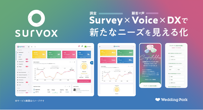 「survox(サーヴォックス)」は、「Survey(調査)」、「Voice(顧客の声)」、「DX」の掛け合わせから生まれた、新たなニーズを見える化し、多角的な視点から解決を支援するサービスです。結婚式場への来館時、打ち合わせ時、結婚式実施時などにカップルの本音をデータとして収集できる他、自社データを全国平均と比較できます。