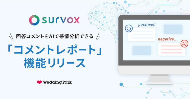 株式会社ウエディングパーク(本社:東京都港区、代表取締役社長:日紫喜 誠吾)のDX本部は、ウエディング業界に特化したカップル向け満足度サーベイツール「survox(サーヴォックス)」において、AIによる感情分析でポジティブ/ネガティブな顧客の声が抽出できる新機能「コメントレポート」を本日リリースいたしました。