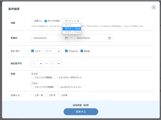3.平均満足度、顧客の成約状況、スタッフといった条件やキーワードでの回答の絞り込み