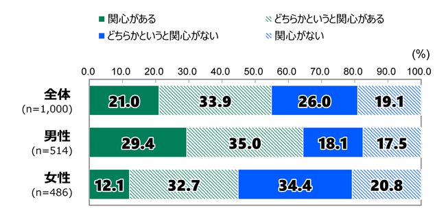 (※それぞれ「関心がある」+「どちらかというと関心がある」、「関心がない」+「どちらかというと関心がない」の値)