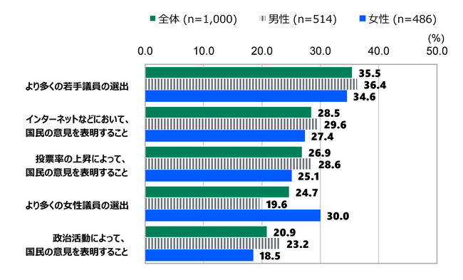 その上で今の政治に「期待できる」か、の問いに「そう思う」の回答は5人に1人、残る8割は「そう思わない」と答え、国会をよりよく機能させる方法として、より多くの若手議員の選出やオンラインの活用で政治に対する関心や意欲を高めるよう求めています。