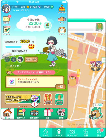 2016年11月より、株式会社ONE COMPATH(当時、株式会社マピオン)が運営している、「歩くことが楽しくなる」仕掛けが満載のウォーキングアプリです。今年で7周年を迎えます。アプリ内に登場する様々な住民キャラクターに話しかけると依頼が出され、クリアすると、地域名産品などが当たるプレゼントキャンペーンに応募できます。健康増進施策を進める自治体や企業、家族や友人同士などチームでの参加も可能です。