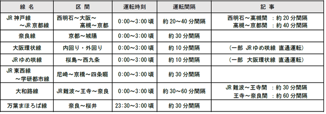 京阪神エリアでは、大晦日深夜から元旦にかけて、以下の区間で終電以降、概ね3時頃まで臨時 列車を