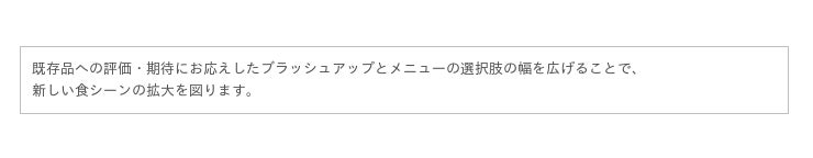 そのコンセプトの理解向上のためパッケージでの訴求強化を図った上、お客様のニーズに沿った味わいと品ぞろえにブラッシュアップいたします。