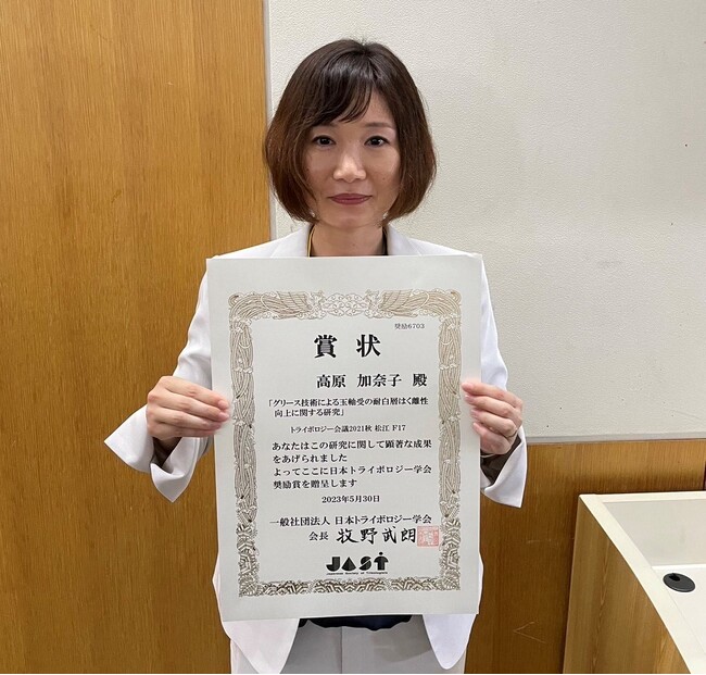 株式会社ジェイテクト(本社:愛知県刈谷市、取締役社長:佐藤和弘、以下「ジェイテクト」)では、研究開発本部材料研究部の高原加奈子が、摩擦や潤滑分野の学会である一般社団法人日本トライボロジー学会から「奨励賞」を授与されました。これは、従来では両立が難しかった耐白層はく離性※1と防錆性を兼ね備えたグリースの開発が評価されたもので、軸受の寿命向上に貢献します。