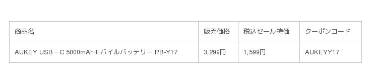 AUKEY最大5V/3A出力USB-CモバイルバッテリーPB-Y17が52%オフセールを開催♪