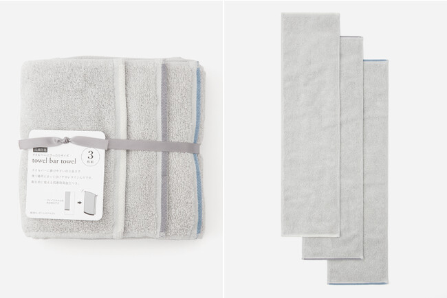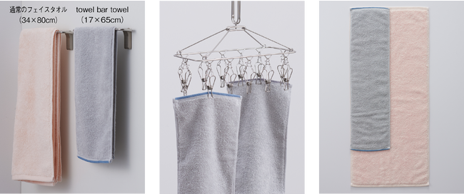 今回新しく登場する「抗菌防臭towel bar towel3枚セット」は、タオルバーにかける際のタオルを半分に折るという手間を減らしたい、手をふく時に使わない部分が多いというデザイナーが普段の生活から感じている煩わしさや思いから開発されました。