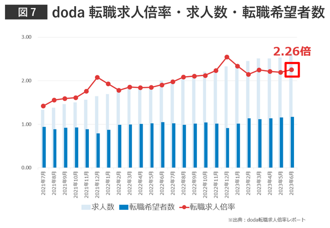 結果からは、人材への重視度や投資傾向の高まりが随所にみてとれました。さらに、最新(2023年7月20日時点)の「doda転職求人倍率*4」は2.26倍という高い数値を示し(【図7】参照)、「転職市場予測2023下半期*3」でも、下半期転職市場は総じて「求人」が増加し活況の見込みを発表しています。転職希望者には追い風が吹いているといえます。
