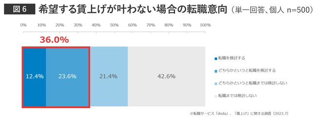 併せて、希望する賃上げが叶わない場合、転職を検討するかと尋ねたところ、検討すると答えた割合は4割弱(36.0%)に上りました(【図6】参照)。