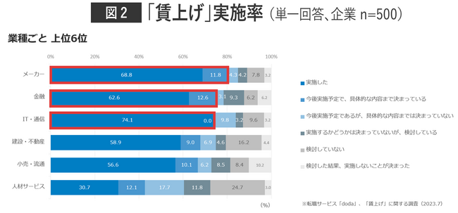 業種ごとに確認すると、賃上げに踏み切った企業が多かったのは「メーカー」(80.6%)で、次いで「金融」(75.2%)「IT・通信」(74.1%)という結果になりました(【図2】参照)。