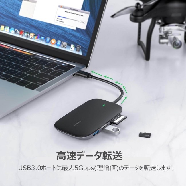 3ポートUSB3.0・4K HDMIポート・SDカードスロット・MicroSDカードスロットが備わって、MacBook /MacBookPro2016、2017、2018/ChromeBookなどの拡張として最適な変換アダプタです。