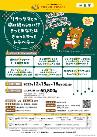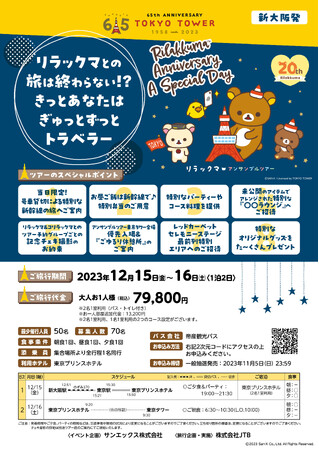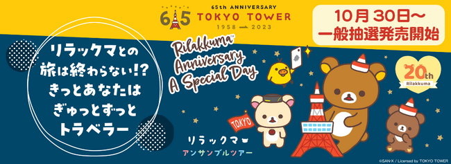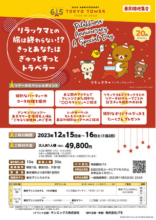 サンエックス株式会社(本社:東京都千代田区、代表取締役社長:千田 洋史)は、今年20周年を迎えたリラックマの日本全国を縦断する記念ツアー「アンサンブルツアー 〜 一緒に広げよう♪ごゆるりSDGs 〜」の終着点のイベントで東京タワーにて実施される『Rilakkuma Anniversary A Special Day』にあわせて2023年12月15日(金)〜16日(土)にて1泊2日のツアー『リラックマとの旅は終わらない!?きっとあなたはぎゅっとずっとトラベラー』を実施することをお知らせします。
