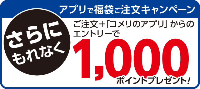 福袋対象商品のご注文+「コメリアプリ」からエントリーいただくと、もれなく「1,000ポイント」をプレゼントいたします!