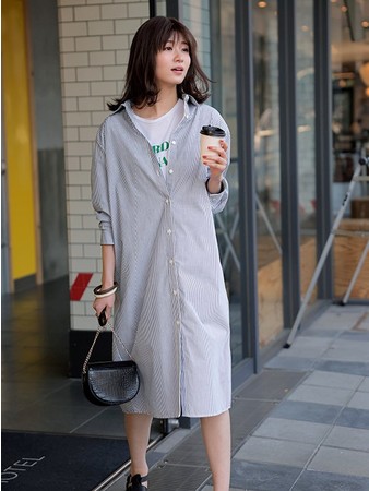 ■特長:ストライプ柄が目を引くシャツワンピース。ワンピースとしてはもちろん、軽い羽織としても活躍し、1着で様々な着こなしがかないます。すっきりと程よいAラインシルエットに、ストライプ柄が縦のラインを強調してスタイルアップ効果が期待できます。