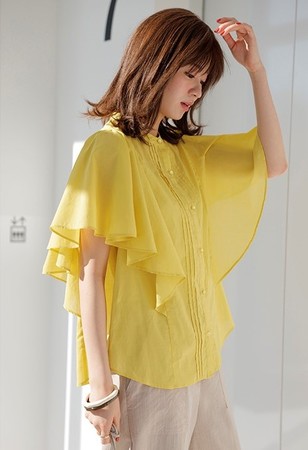 ■特長:大きめのフリル衿が可愛いサマーブラウス。1枚着るだけでトレンド感を演出できます。とろみ感のある微光沢素材に、きらっとひかるフロントボタンがアクセントをプラス。カーディガンとのレイヤードスタイルもおすすめです。